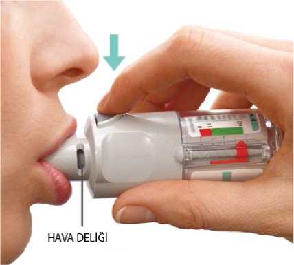 • Nefesinizi yavaşça ve tam olarakveriniz. Hava deliklerini kapatmadandudaklarınızı ağızlığın çevresinekapatınız. İnhalatörünüzü boğazınızınarkasına doğru yönlendiriniz.